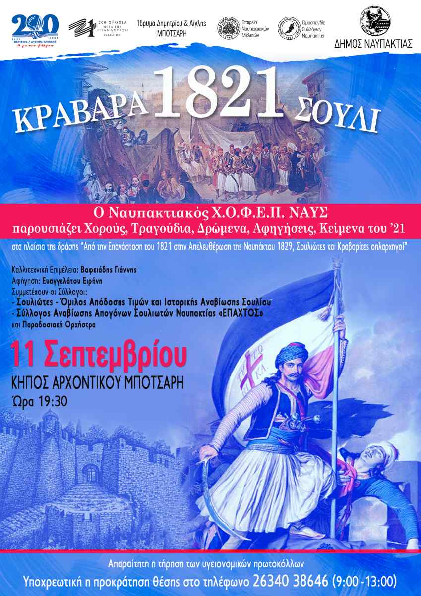 Ο Δήμος Ναυπακτίας σε συνδιοργάνωση με την Περιφέρεια Δυτικής Ελλάδας πραγματοποιεί Διημερίδα στις 11-12 Σεπτεμβρίου 2021 με θέμα: «Από την Επανάσταση του 1821 στην Απελευθέρωση της Ναυπάκτου. Σουλιώτες και Κραβαρίτες οπλαρχηγοί», στον Αύλειο Χώρο του Ιδρύματος Δημητρίου και Αίγλης Μπότσαρη.