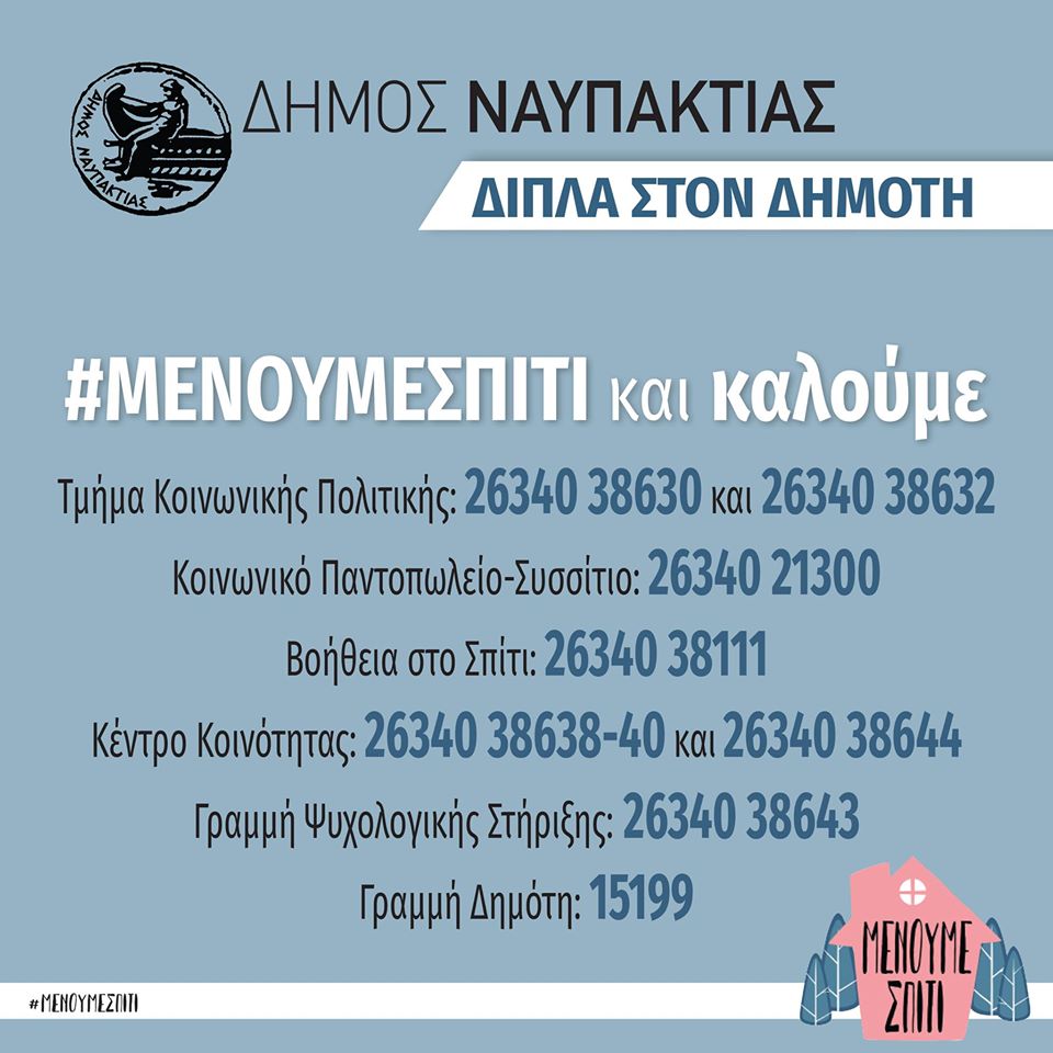 Το σύνολο των δομών του Δήμου Ναυπακτίας βρίσκεται στο πλευρό των δημοτών και στην πρώτη γραμμή της αντιμετώπισης των επιπτώσεων του κορονοϊού στην κοινωνία μας. Η Διεύθυνση Κοινωνικής Αλληλεγγύης και Κοινωνικών Υποθέσεων και το Τμήμα Κοινωνικής Πολιτικής συντονίζουν ένα πλήρες σχέδιο στήριξης όσων έχουν ανάγκη ή είναι ηλικιωμένοι ή ανήκουν σε ευπαθείς ομάδες.